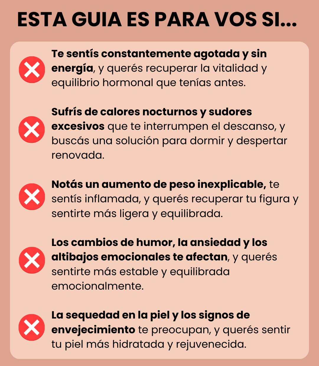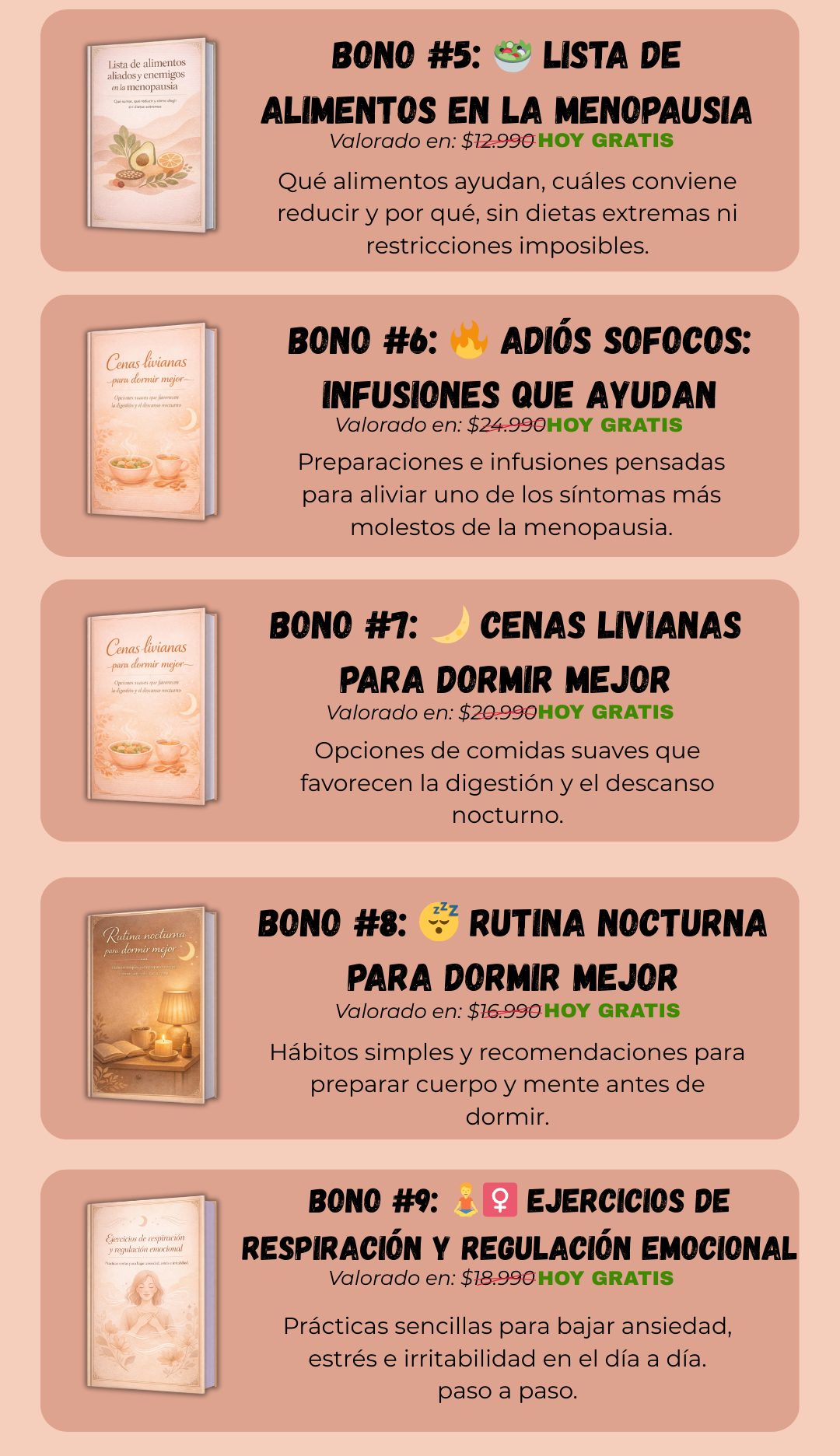 "No puedo creer todo lo que aprendí con este ebook. Los sofocos ya no me dominan, duermo bárbaro y mi estado de ánimo mejoró notablemente. La información está presentada de forma muy accesible y los ejercicios son fáciles de seguir. ¡Gracias por crear algo tan valioso!"
