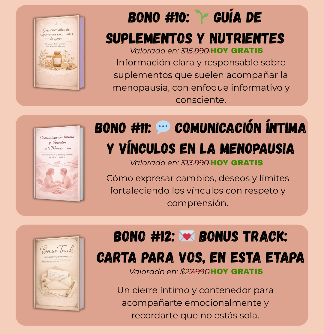 "Después de leer este ebook entendí que la menopausia no es el fin, sino el comienzo de una nueva etapa maravillosa. Los tips para manejar los cambios hormonales son excelentes y realmente funcionan. Me siento más vital y feliz que nunca. ¡Un recurso imprescindible para toda mujer!"